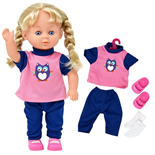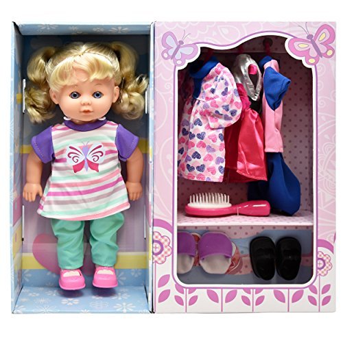 -. Feature : SUPER CUTE LOVEABLE DOLL: This doll offers an incredible way to keep your little one entertained for hours and gives her a best friend that she can hang out with. The doll also comes with a lot of accessories, 3 different outfits with hangers for all occasions, shoes, slippers, and a brush. / NATURAL APPEARANCE AND REALISTIC DETAILS: Our dolls look like real babies and have intricate details like stunning blue eyes, natural expressions and rightly proportioned arms and legs. Kids will love to play with the beautiful shiny blond hair. / EFFECTIVE CHILD DEVELOPMENT: This incredible doll provides a superior alternative for pretend play - it helps in cognitive development of the child and instills in her emotions of love and nurturing. It is also an ideal way to familiarize the baby with the body parts, and to acquaint her with grooming, dressing independence, and hygiene practices with the help of clothes, plastic shoes, and brush. / TRENDY AND SAFE: This doll comes with an adorable vibrant colored striped shirt with butterfly print and matching pants, pink shoes, and white socks - trendy and modern look! Her pigtails make her look irresistibly cute! Take her along wherever you go and dress her up accordingly! Pajamas and slippers for bedtime fun, party dress, and extra top for any occasion! / MADE FOR DOLLS TO PLAY BRAND - See our other Dolls, Strollers, Playpen, etc. by clicking on the Brand Name right under the product title. Dolls To Play is an exclusive Company, manufacturing higher end Dolls and accessories for deserving children. Our dolls, toys, and accessories are the perfect gift for Christmas, Birthdays, or any other time!