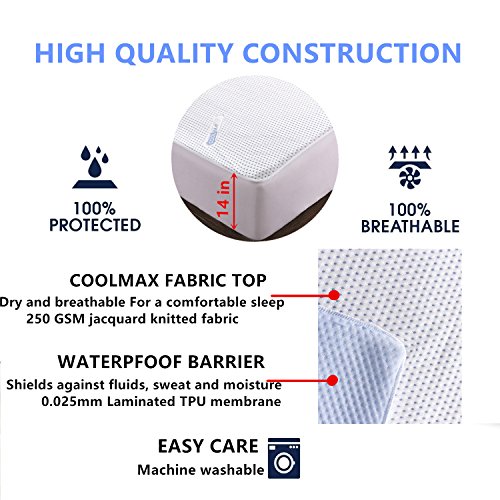 -. Feature : HIGH-TECH COOLMAX - Moisture resistant,breathable cool and regulates temperature, that moves perspiration away from the body and through the fabric, where it can evaporate quickly, and keeping you cool, dry and comfortable at night / HIGH-QUALITY TEXTURE - Cover top: 250 GSM Coolmax jacquard knitted fabric, dense and soft; back: 0.025mm Laminated TPU membrane, shields against fluids, sweat and moisture / MOST BENEFICIAL - Protects Against Dust Mites, Fluids, Urine, Perspiration, Allergens And Bacteria. Perfect for Night sweats,Hot flushes, Asthma, Eczema or Incontinence / QUEEN SIZE - 60" X 80", knitted skirt stretches to fit up to 18" deep mattress with elastic all around / EASY CARE - Machine wash cold tumble dry low; do not iron; do not bleach; do not use fabric softener. It will stand up to YEARS of laundering without losing its protective properties