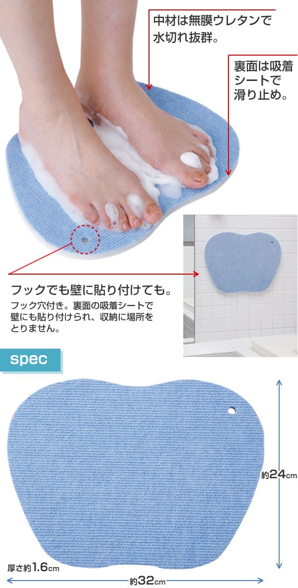 表面の特殊繊維で足裏の汚れをかき出すマット。裏面すべり止め加工で壁にもピタッと貼れて邪魔にならない。足裏、角質の洗浄に。