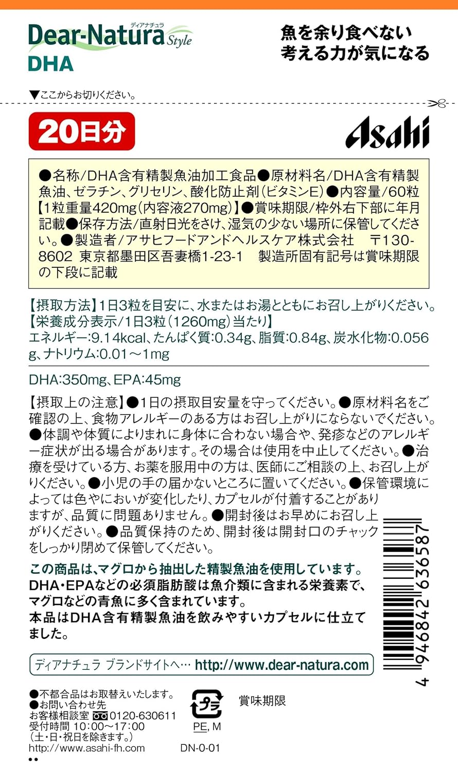 原材料 : DHA含有精製魚油、ゼラチン、グリセリン、酸化防止剤(ビタミンE)栄養成分 : エネルギー:9.14kcal、たんぱく質:0.34g、脂質;0.84g、炭水化物:0.056g、ナトリウム:0.01~1mg、DHA:350mg、EPA:45mg内容量 : 180粒カロリー : 3粒あたり9.14kcal