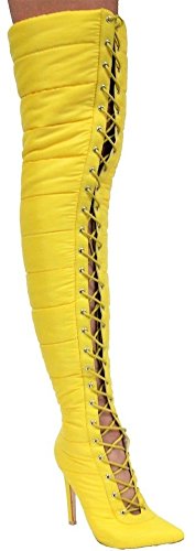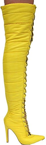 Cape Robbin Gigi-23 Over Knee Pointed Toe Lace Up Puffer Thigh High Heel Boots Yellow