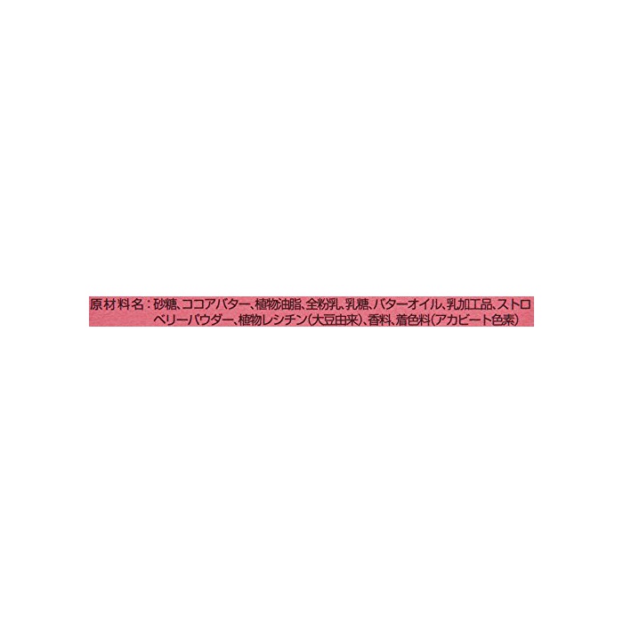 원재료:설탕,코코아 버터,식물성 기름지,전분유,유당,버터 오일,유가공품,스트로베리 BOW 다《―》,식물 레시틴(대두 유래)고, 향료,착색료(《아카비토》색소)