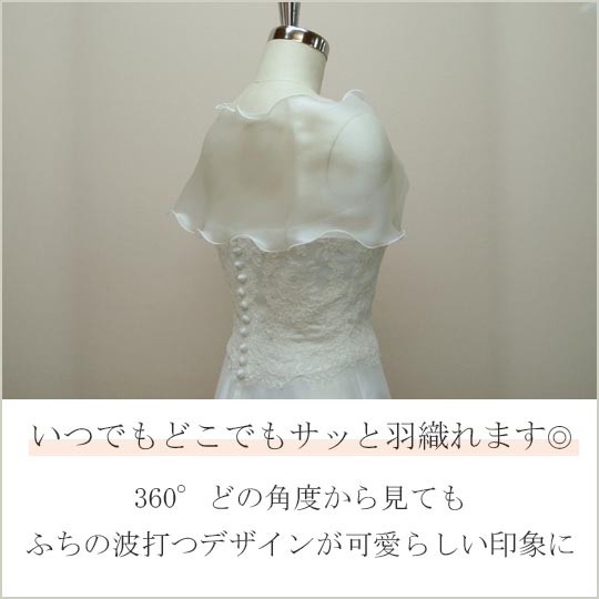 ウェディングドレス用のショール。 ウェディングドレス用のショールを探していてたどり着きました! ベールを外した後にウェディングドレスにあわせましたが、とても可愛かったです。 ちなみに私のウェディングドレスはオフホワイトでしたが、ショールはアイボリーを購入しました。 |