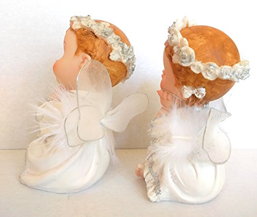 Each angel measures approx.: 5.5”(H) x 5”(W) x 3”(D). Beautifully hand painted and made of polyresin. Figurines are predominately white with silver accents to blend with any decor. Wings on both angels are made of fabric with feathers, and are repositionable. They are not toys and are not intended for children under 8 years of age.