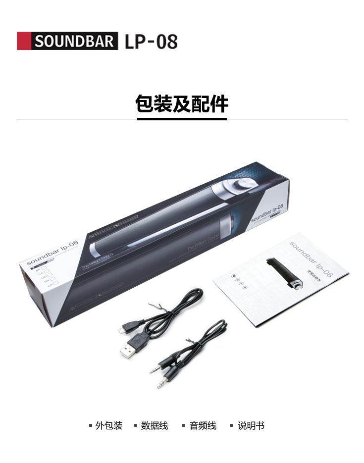 音箱1个,音频线1条(1.5m),充电线1条(0.8m),包装盒1个。