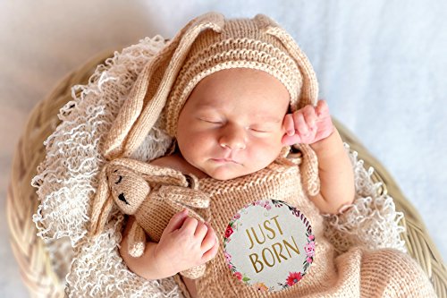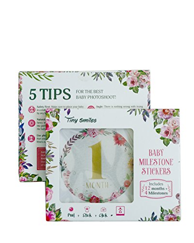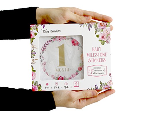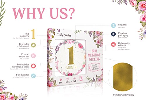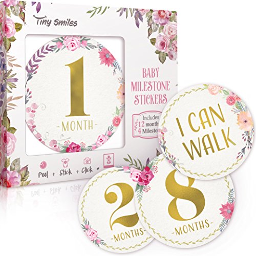 Baby Monthly Milestone Stickers - 16 Premium Floral Metallic Gold Stickers for First Year - 0 to 12 Month Onesie Belly Stickers - Best Baby Shower Gift or Scrapbook Photo Keepsake