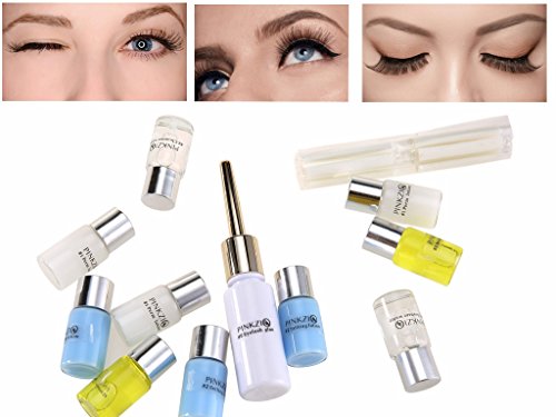 Pinkzio Profession Eyelash Perming Kit Includes: 3 x Perm Solution 5ml 3 x Setting Lotion 5ml 2 x Essence Moisture Lotion 5ml 2 x Cleanser Lotion 5ml 3 x Silicone pad 3 x White rod (S M L )