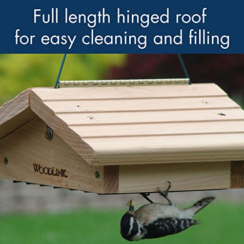 -. Feature : Large capacity suet feeder; hold two suet cakes / Product constructed of re-forested, kiln dried, inland red cedar / Screwed together construction, powder-coated metal screen bottom / Full length hinged roof for easy cleaning and filling / Hanger included, Made in USA