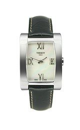 Stainless steel case with a black leather strap. Fixed stainless steel bezel. White mother of pearl dial with silver-tone hands. Roman numerals mark the 3, 6, 9 and 12 o'clock positions. Dial Type: Analog. Quartz movement. Scratch resistant sapphire crystal. Solid case back. Case diameter: 24.5 mm. Case thickness: 7.55 mm. Rectangle case shape. Band width: 16 mm. Tang clasp. Water resistant at 30 meters / 100 feet. Functions: hour, minute. Casual watch style. Watch label: Swiss Made. Item Variations: T0073091611302. Tissot T-Lady Generosi-T White Mother of Pearl Dial Black Leather Ladies Watch T007.309.16.113.02.Feature