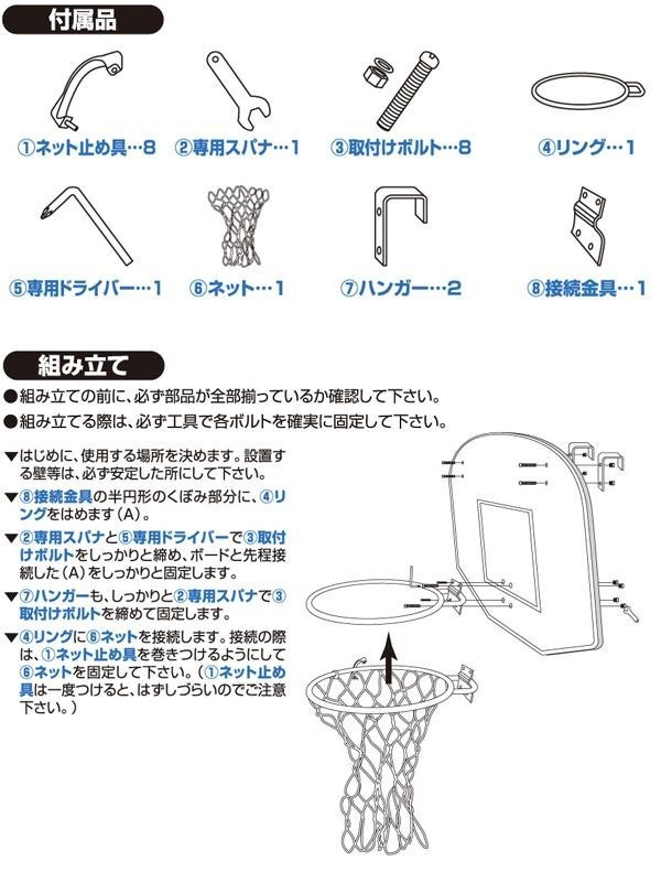 | 仕様 | 組立式 リング内径:約28.5cm(バスケットボール5号対応) ボードサイズ:約605×460mm リング折りたたみ可 |