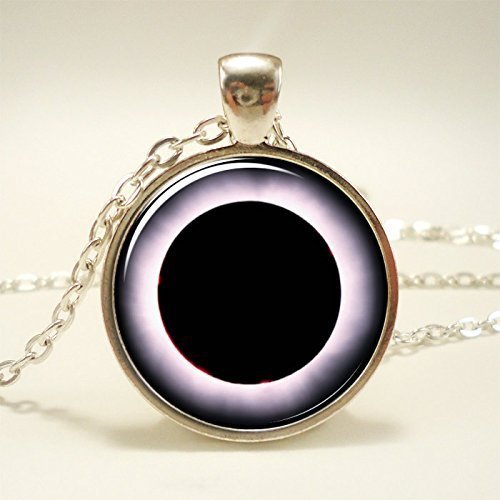 This handmade art pendant features a solar eclipse design! Pendant size: 1" inch (25 mm) Chain length: 24" inches Art print sealed under smooth glass cover Zinc alloy frame and chain, lead and nickel free Handmade in the U.S.A.