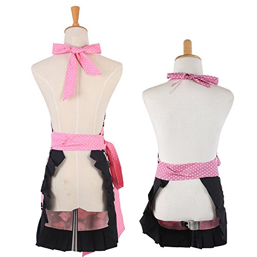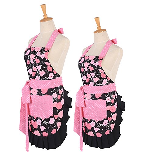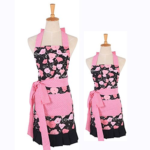 Pink Morning Glory Pattern Double Layer 100% Cotton Garden Aprons Cute Chef Bib Women and Kid Girl Cooking kitchen or Backing Apron with One Practical Front Pocket (Mom-Child Set)