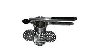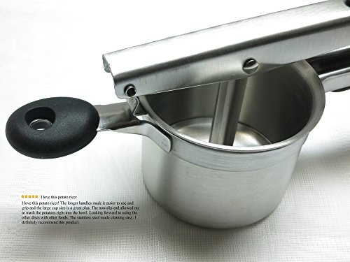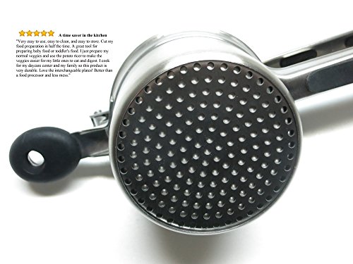 SSO Stainless Steel Potato Ricer & Baby Food Strainer, Super Quality Large Cup with Black Silicone Grips, Includes 3 Interchangeable Disks (Fine, Medium, Coarse), Durable & Dishwasher Safe