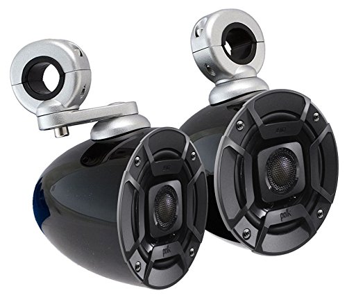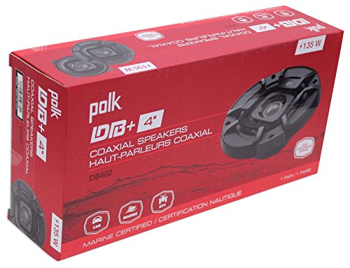-. Feature : (2) Polk Audio DB402 4" 270 Watt Car Audio Marine/ATV/Motorcycle/Boat Speakers. High performance audio upgrade that delivers signature quality sound that goes beyond OEM factory systems / Marine certified with IP65 rating (water- and dirt-resistant) and tested for salt-fog, UV and humidity. Polypropylene and UV tolerant cone with waterproof inner and outer surrounds. Simple drop-in installation for any vehicle including cars, boats, ATVs-you name it / Zero tweeter protrusion and reduced mounting depth for a precise fit. Dynamic Balance technology offers a rich, clean, full-range sound. ¾", 20mm Tweeter ensures clear, balanced mids and highs. 45 Watts at Continuous Power; 135 Watts at Peak Power / Kicker 40KMMTES Mini Marine Wakeboard Tower Enclosures. 4" empty enclosure. Billet-aluminum mounting clamp construction. Mini extension arm / Durable terminal connectors. For single and dual sets of drivers. Weather-proof. 9-degree axis rotation. . /8"-1-1/4" round tubing. 1" square tubing
