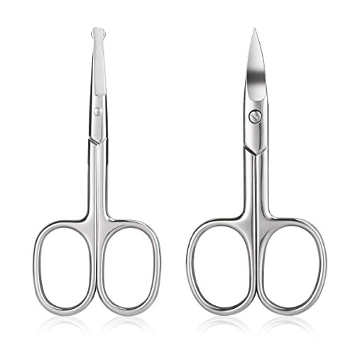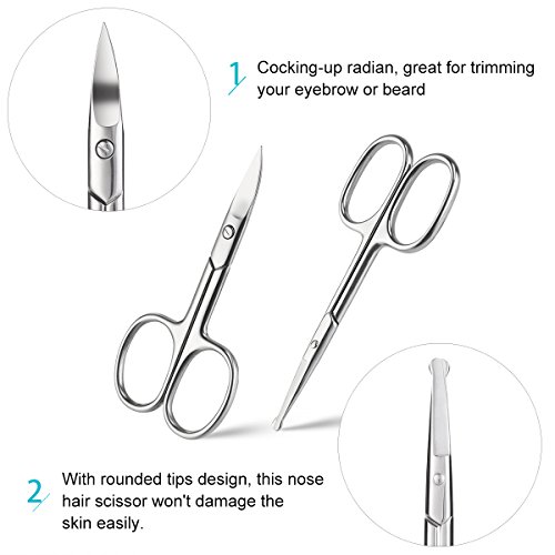 FOR BEARDS & MUSTACHES: The short-bladed sharp-tipped scissors are made especially for trimming and shaping beards and mustaches. BENT BLADE & SAFETY TIP. For those stray hairs you don't want: The round-tipped pair is for clipping hairs at your nose and ears. With the round tips, you don't have to worry about stabbing yourself.