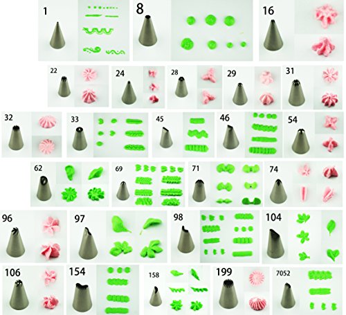- Tips set Includes a Flower Nail and Coupler and a collection of Open Star, Closed Star, Ruffle, Basketweave, Petal, Round, Leaf, Drop Flower and Specialty nozzles.