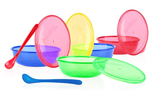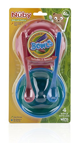 -. Title : Nuby 4 Stackable Feeding Bowls with Locking Lids and Spoon
