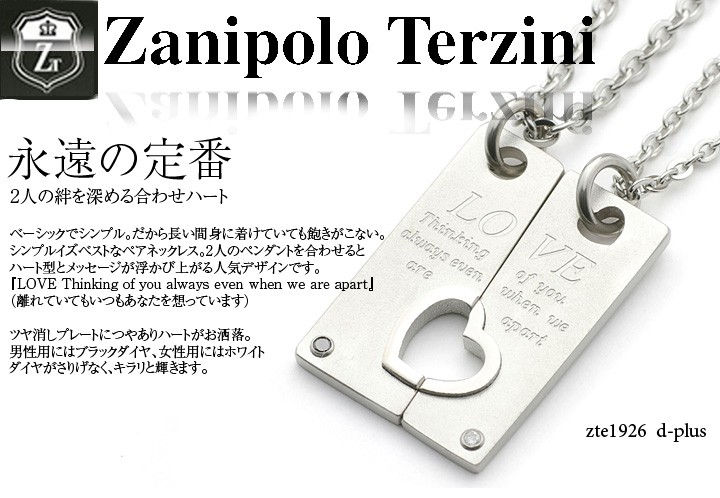 ベーシックでシンプル。Zanipolo Zanipolo Terzini(ザニポロ タルツィーニ)の新作ペアネックレス!ベーシックでシンプル。だから長い間身に着けていても飽きがこない。シンプルイズベストなペアネックレス。2人のペンダントを合わせるとハート型とメッセージが浮かび上がる人気デザインです。『LOVE Thinking of you always even when we are apart』(離れていてもいつもあなたを想っています)ツヤ消しプレートにつやありハートがお洒落。男性用にはブラックダイヤ、女性用にはホワイトダイヤがさりげなく、キラリと輝きます。【サイズ】トップサイズ:約 23.5mm×8.0mm(男女共通)チェーン材質:サージカルステンレススチール(316L)、チェーン長さ:約 40+5cm(男性用)、約 37+3+3cm(女性用)【素材】石:ダイヤモンド、トップ材質:サージカルステンレススチール(316L)【付属品】こちらの商品は■専用ボックス ■専用巾着袋 ■ショッパー(紙袋) にてお送りさせていただきます。※ボックスや袋の仕様は変更となる場合がございます。