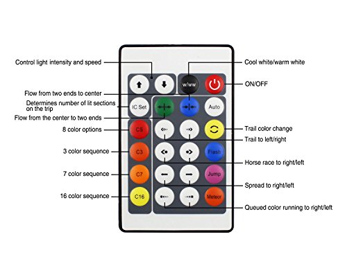 - Build-in IC chips controlled by 24-key remote, 10 single colors and 3/7/16 colors combination with 15 effects, 156 mode patterns in total, speed and brightness adjustable