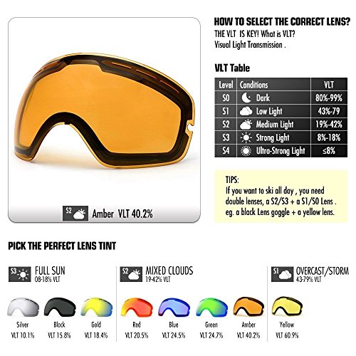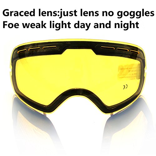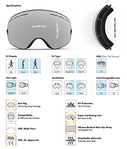 -. Feature : COPOZZ UNIQUE SKI GOGGLES - Offer fashionable styling with an advanced lens technology for excellent optical clarity and fog-free performance. Adjustable no-slip elastic strap. You can wear the myopia glasses which length less than 5.5 inch with this ski goggles. / SPHERICAL WIDE VISION DESIGNED - Provide a larger and clear view, less distortion and slight tint helps the identify the ditch and obstruction on the trails; Maximum Peripheral Vision(over 180 degree), will not miss the skiers beside you. / ANTI-FOG AND UV PROTECTION - Detachable double lens providing clear optics and superior seal, Anti-fog/anti-scratch coating provides protection against unwanted lens fogging and most scratch, 100% UV protection prevent glare-cutting significantly to the maximum. / HIGH PERFORMANCE VENTING - 3 Layers breathable foam designed to reduce fogging and optimize flow of air over inside of lens; venting ports control airflow, while preventing clogging from snow and ice, warm your eyes. Have fun on the slope with clear vision. / SAFE AND COMFORTABLE - COPOZZ ski goggles have certified by FDA DROP BALL TEST and met EN 174 standard; Soft and durable TPU frame, buffering impact and protecting your face and eyes to the maximum, multiple layer foam offers a comfortable wearing.