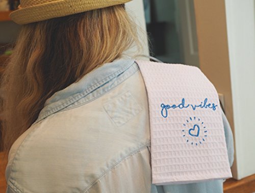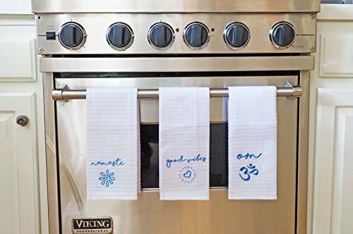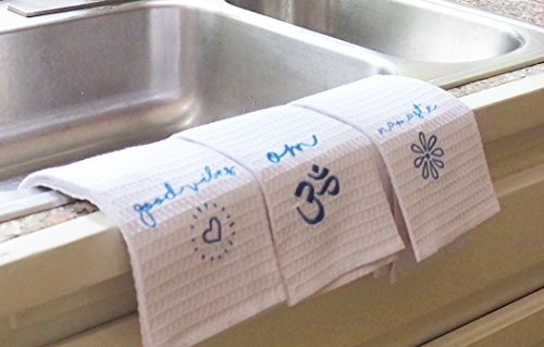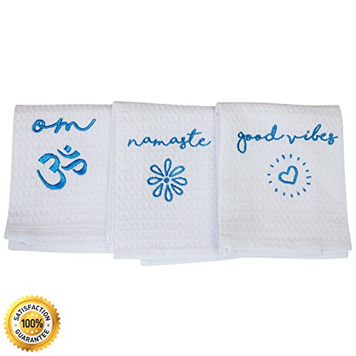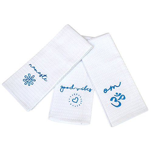 - UNIQUE HAND TOWELS: Set of 3 lovely white towels with empowering sayings embroidered in beautiful blue onto each 25”X15” towel: Good Vibes, Namaste, Om.