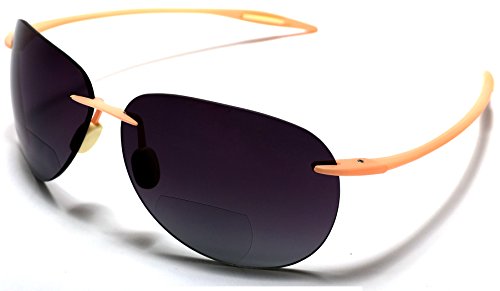 These flexible, break-resistant Samba Shades bifocal sunglasses are the ultimate sport classic aviator rimless bifocals sun readers on the market. The high quality sturdy TR90 glasses are designed to bend and retain their shape for a very long time. They're scratch resistant and break resistant. They're extremely light so one can forget that they're wearing them. These cool form bifocal sun readers come in matte black, matte brown and matte pink.