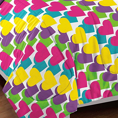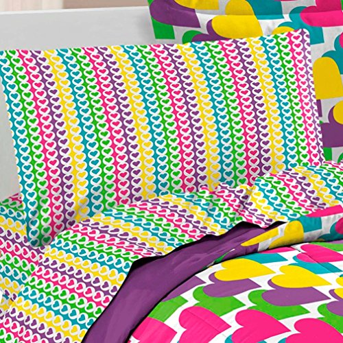 - Feature : Design of hearts in bold shades of yellow, purple, lime green, magenta and turquoise in a diagonal striped layout / 5 Pc Set includes: 1 comforter, 1 standard sham, 1 flat sheet, 1 fitted sheet and 1 pillowcase / Comforter size: Twin: 64" x 86"; Sham size: 20" x 26" / Care: Machine washable