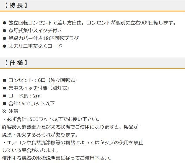 fk094igrjs独立回転コンセントで差し方自由コンセントが個別に左右90度回転します サイズ 個装サイズ:9×35×3cm 重量 個装重量:340g 生産国 中国 点灯式集中スイッチ付き独立回転タップ 独立回転コンセントで差し方自由コンセントが個別に左右90度回転します