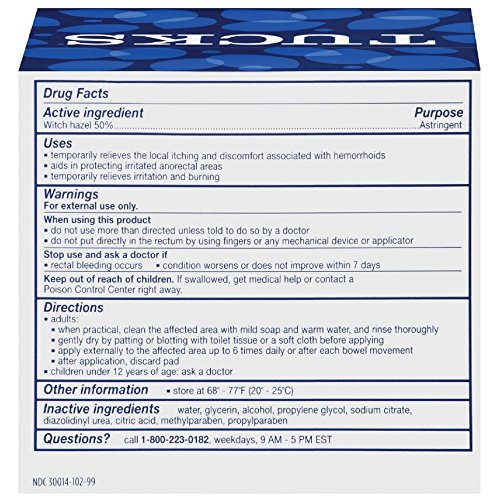 Studio : Tucks Publisher : Tucks Binding : Health and Beauty Product Description Hemorrhoidal Pads with Witch Hazel. Cooling, soothing, pH balanced. For hemorrhoidal and vaginal care. You can rely on Tucks Pads for immediate relief from itching, burning and irritation. Tucks Pads are safe for septic and sewer systems. Tucks Pads decom 0