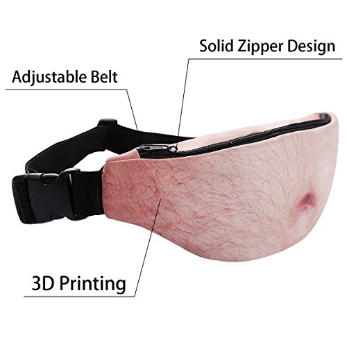 -. Feature : TOP PRANK GIFT -- the most lifelike waist bag like human's belly; absolutely a grab bag gift and brings laughs to everyone in the party; perfect for Christmas party, white elephant party, anniversary, bachelor party, or special day / REAL DAD BOD -- a big belly pack with bushy hair, that's what a man looks like; so, it's an ideal present for fathers, husbands and boyfriends; of course, women and girls can wear this to act as a man / LARGE CAPACITY -- the fanny pack designed with a small zipper pocket inside helps you keep your important stuff, like money; the main pocket is 15 x 7 inches, you can put your phone, headphones, keys, wallet and even bottles in it / ADJUSTABLE BELT -- the zipper waist punch fits waist up tp 50 inches ; give you a snug and comfortable feeling when wearing it / DURABLE AND COMFORTABLE -- made of leather and PU; anti-wrinkle and waterproof waist pack, easy to clean and store; an eye-catching sports bum bag for hiking, running and travel