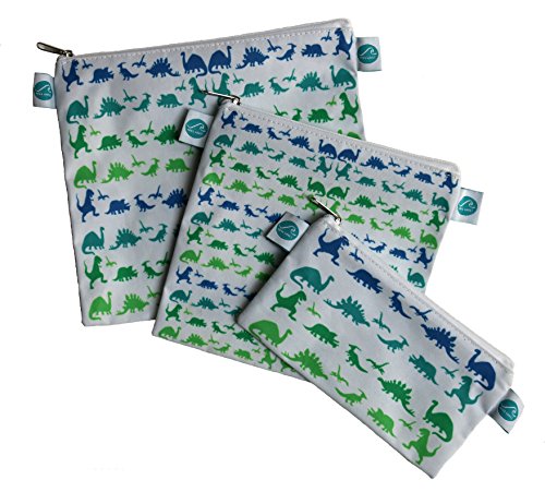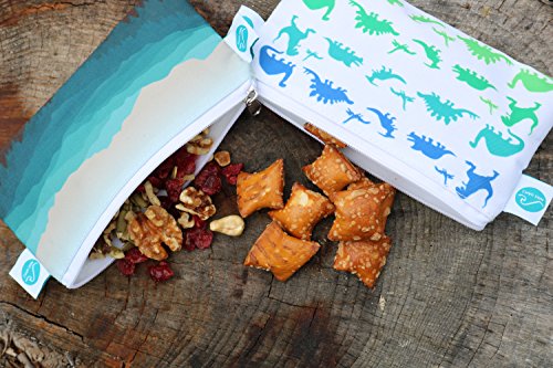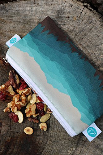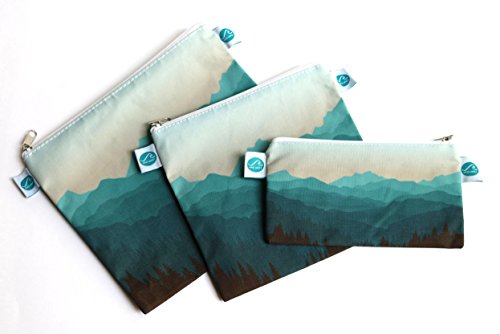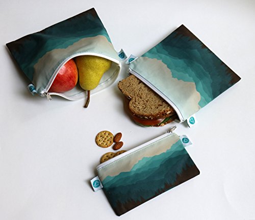 Reusable Sandwich & Snack Bags by MAKE WAVES – Set of 3 Designer Cotton – Eco Friendly, Washable, with Zipper – Mountain or Dinosaur Theme (Mountains)