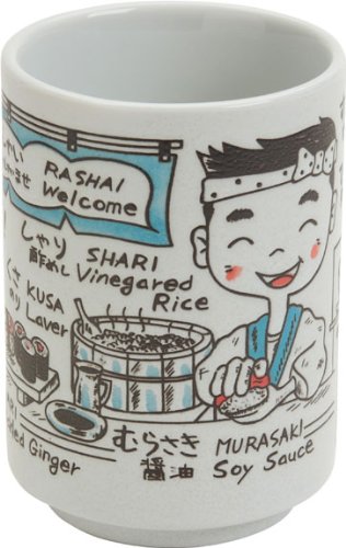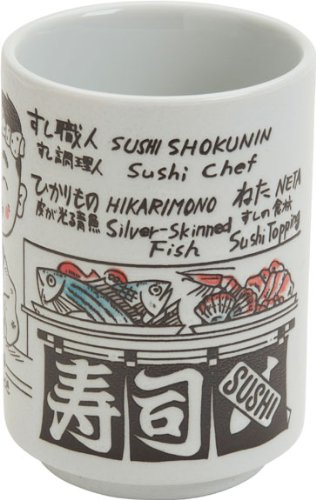 -. Binding : Kitchen -. Brand : EverythingChopsticks -. Color : White -. Feature : 1 ceramic tea cup; made in Japan / Fun tea cup illustrating sushi talk with both English and Japanese translations / Cup is about 4 inches tall with a textured finish / Cup is about 10 oz. -. Label : EverythingChopsticks -. Manufacturer : EverythingChopsticks -. MPN : TK4822 -. PackageQuantity : 1 -. PartNumber : TK4822 -. ProductGroup : Kitchen -. ProductTypeName : KITCHEN -. Publisher : EverythingChopsticks -. Studio : EverythingChopsticks -. Title : Cup with Illustrations of Sushi Talk, Japanese Made; 1 Cup