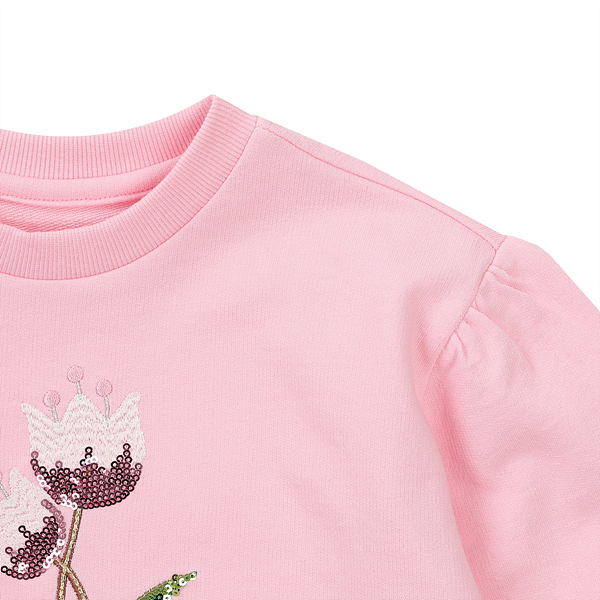 핑크컬러에 튜울립자수패치가 포인트가 되어 화사한 느낌의 코디가 용이한 티셔츠입니다.