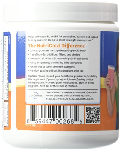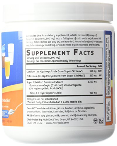 -. Binding : Health and Beauty -. Brand : Nutrigold -. EAN : 0859447002685 -. Feature : The Gold Standard Clinically-Proven SuperCitrimax® Garcinia Cambogia Extract with 5 U.S. Patents / Features 60% HCA bound to Potassium/Calcium Salts in a patented ratio proven to work for weight-loss / 1500 mg per scoop ~ 90 scoops per container ~ That's a full 30 day supply at the high dosage of 4500 mg per day! / Specifically formulated to be odorless, tasteless, colorless, and mix instantly in water or any juice / Supports appetite control, aids to burn fat, and helps loose weight 3 times more than diet and exercise alone* -. Label : NutriGold -. Manufacturer : NutriGold -. MPN : Garcinia Cambogia Extract -. PackageQuantity : 1 -. PartNumber : Garcinia Cambogia Extract -. ProductGroup : Health and Beauty -. ProductTypeName : HEALTH_PERSONAL_CARE -. Publisher : NutriGold -. Studio : NutriGold -. Title : #1 Pure Garcinia Cambogia Extract, 1500mg, 90 Servings (100% Pure Water-Soluble Garcinia Camboiga GOLD) Features 60% HCA SuperCitrimax® Garcinia with 5 U.S. Patents - Clinically-Proven Appetite Suppressant and Weight-loss That Works -. UPC : 859447002685