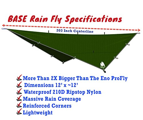✔ 117% BIGGER THAN ENO PROFLY RAIN TARP. THAT'S 77.5 SQUARE FEET BIGGER AND OURS COMES WITH STAKES! Truly waterproof in a torrential downpour! Stakes, ropes (guy lines) and tensioners included. Easily covers doublenest hammocks. Our 12' fly can be angled out to provide a large covered area for cooking or relaxing or staked near the ground on both sides of the hammock. Twice the size of the ENO Profly and makes the Bear Butt camping tarp look tiny by comparison. GET YOURS TODAY!
