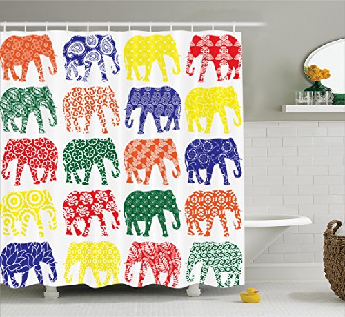 Ambesonne Elephants Decor Collection, Colorful Elephants in Patterns in a Row National Folklore Spiritual Yoga Image Print, Polyester Fabric Bathroom Shower Curtain, 84 Inches Extra Long, Orange Navy