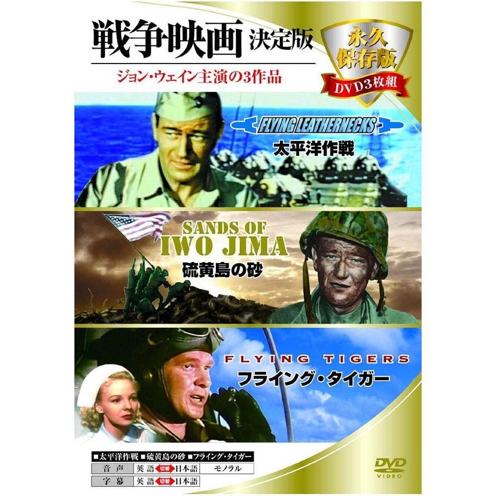 ジョン・ウェイン主演の戦争映画「太平洋作戦」「硫黄島の砂」「フライング・タイガー」が入ったDVD豪華3枚組!映画好きにも、初心者にもおススメの永久保存版。
