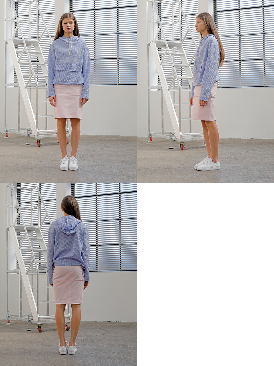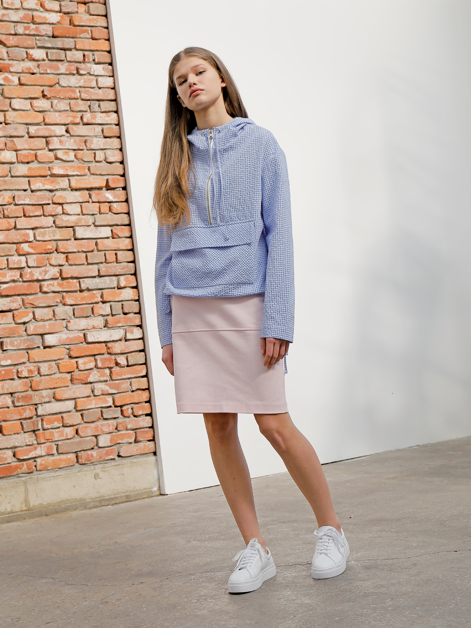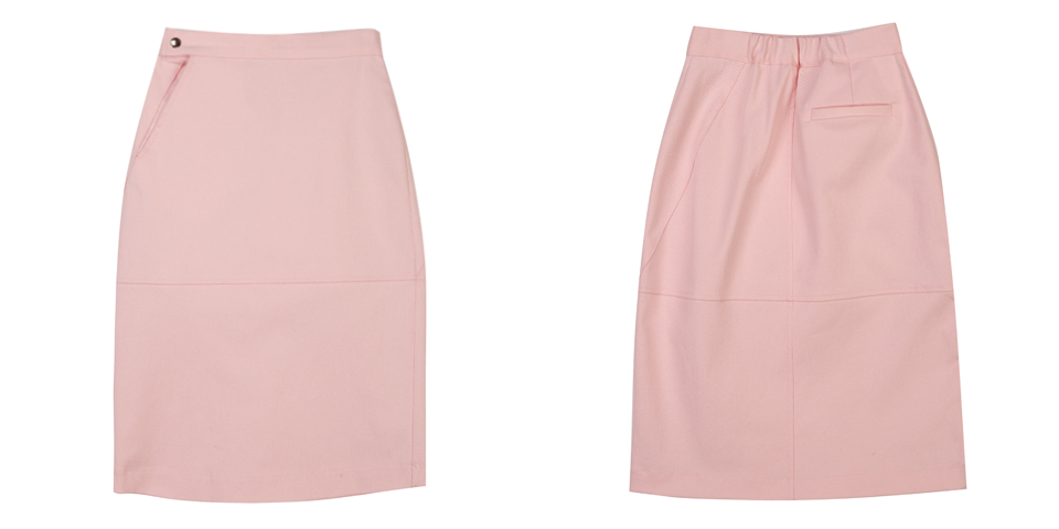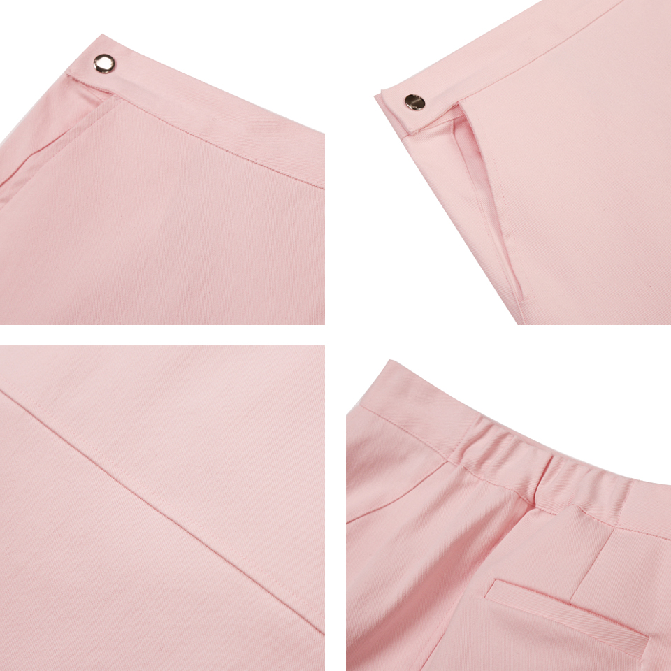 코튼 스판 소재의 미디 기장 스커트입니다. 양쪽 사이드라인이 뒤틀린 형태로 비대칭 디자인되어 있습니다. 여밈 부위에는 금속 로고 스냅 디테일이 있으며 허리 뒷부분에 엘라스틱 밴드가 들어가 있습니다. 핑크와 베이지 두 가지 색상으로 출시되었습니다.
