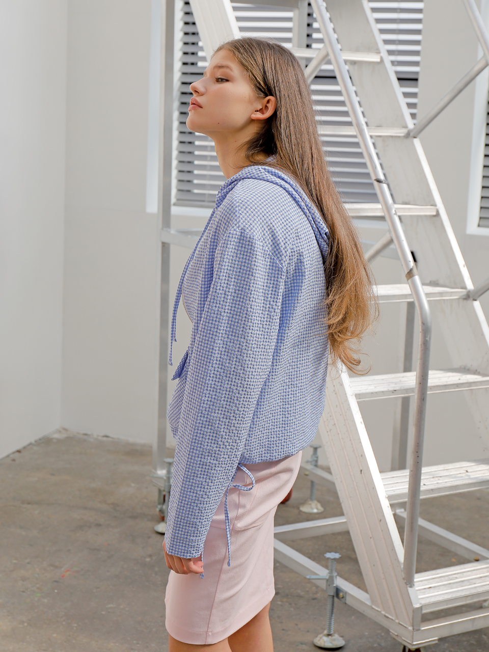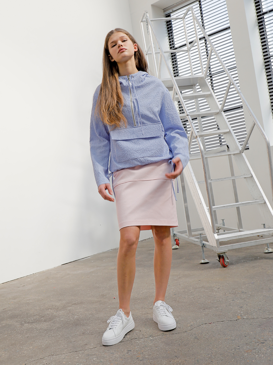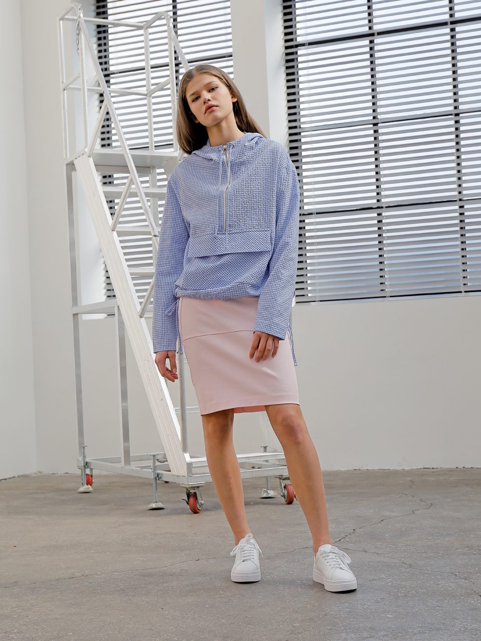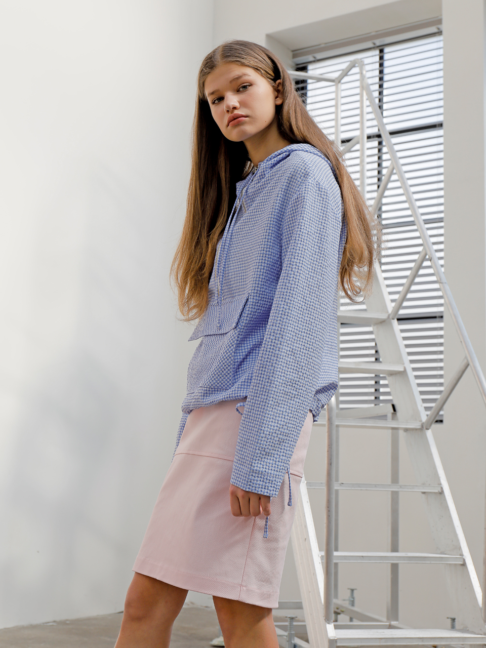 코튼 스판 소재의 미디 기장 스커트입니다. 양쪽 사이드라인이 뒤틀린 형태로 비대칭 디자인되어 있습니다. 여밈 부위에는 금속 로고 스냅 디테일이 있으며 허리 뒷부분에 엘라스틱 밴드가 들어가 있습니다. 핑크와 베이지 두 가지 색상으로 출시되었습니다.