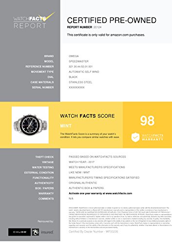 -. Feature : Omega Speedmaster 321.30.44.52.01.001 with black dial / Authenticated by WatchFacts. Grade Rating: 98 / Condition: Mint / Comes with original box and manufacturer's papers offered with this watch / Automatic-self-wind movement / Watch year: 2017