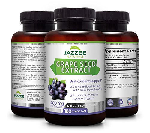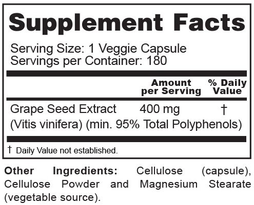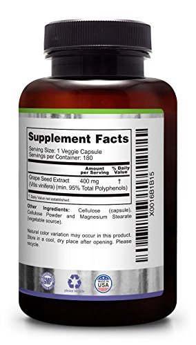 MAXIMUM VALUE / MAXIMUM STRENGTH: Each bottle contains 180 veggie capsules, each capsule contains a healthy 400 mg of Grape Seed Extract, and the extract contains a minimum of 95% Polyphenols. This combination means you are getting the most antioxidants per bottle possible!