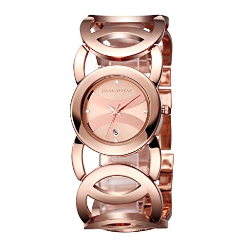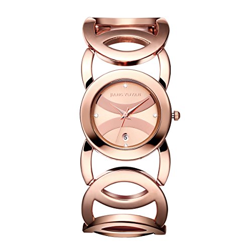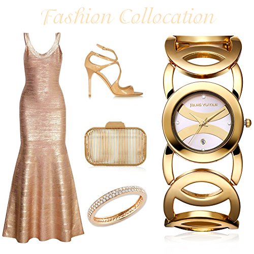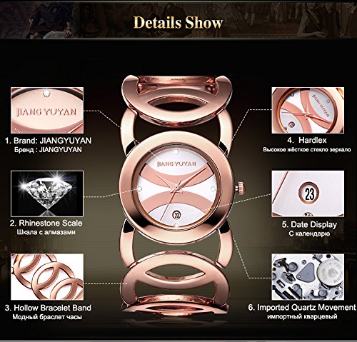 JIANGYUYAN Clearance Womens Ladies Unique Fashion Classic Casual Luxury Business Dress Runway watches Quartz Gold-tone Round Dial Stainless Steel Goldtone Round-Hollowed Bracelet Bangle wristwatch