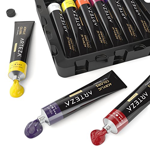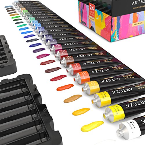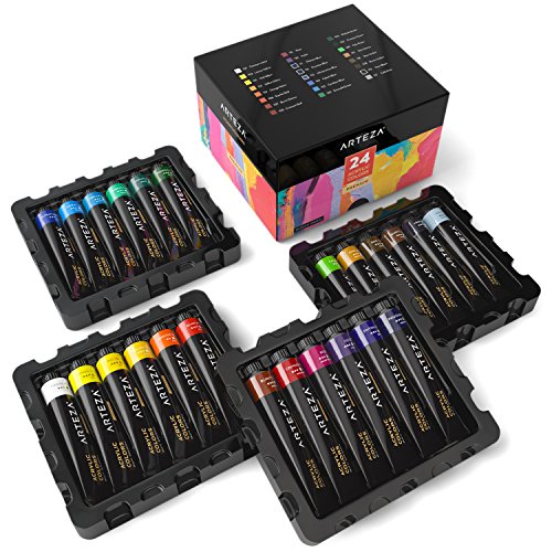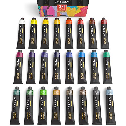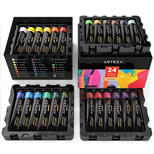 Arteza Acrylic Paint Set, 24 Colors / Tubes (22 ml/0.74 oz.) with Storage Box, Rich, Pigments, Non Fading, Non Toxic for the Professional Artist, Hobby Painters & Kids