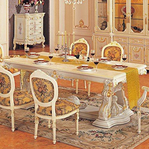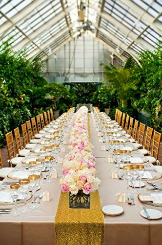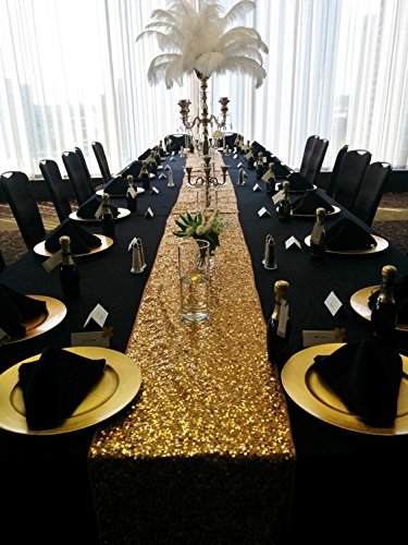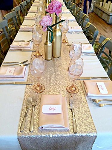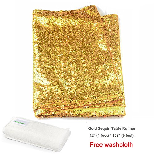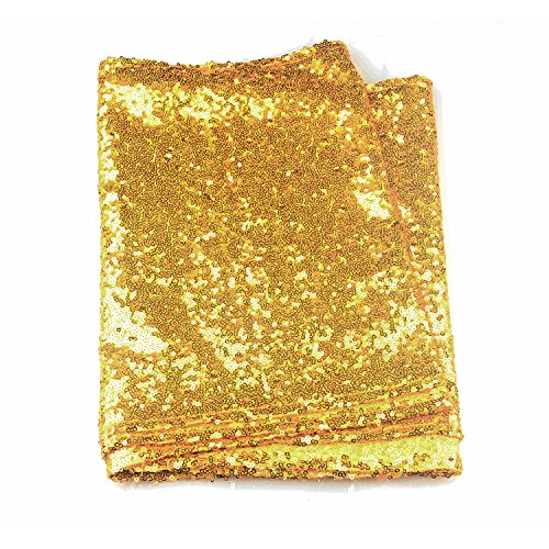 1 The entire gorgeous gold sequin table runner material: sequins fabric with mesh fabric backing, dimension:2" (1 foot) * 108" (9 feet). This table runner is hemmed with completely sparkle sequins,it adds a perfect touch of glamour to any table,has sequins all over perfect for any party and wedding,whether you are planning a rustic wedding or an elegant affair, don't be afraid to add some shine to your decor!
