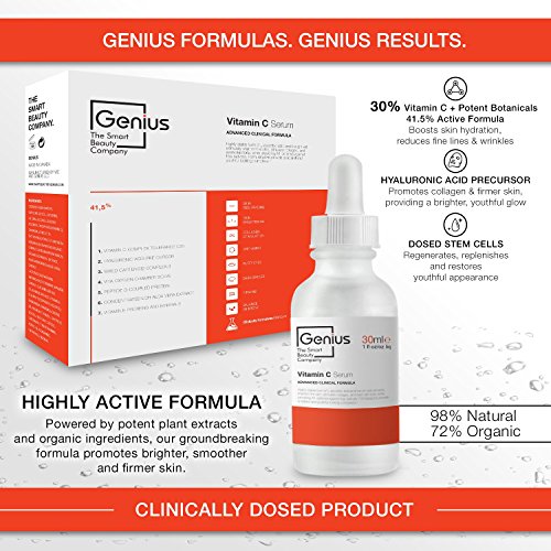 -. Feature : GENIUS FORMULATIONS: STABLE and POWERFUL form of Vitamin C (Stay-C25) is suspended with an abundance of antioxidants including a concentrated dose of hyaluronic acid pre cursor which helps lift, firm, brighten, as well nourish the skin surface. / OVER 40% ACTIVE INGREDIENTS: This serum contains 30% (Stay-C25) which is a highly stable and quality form of Vitamin C. In combination with botanical extracts, and hyaluronic acid this vitamin C facial serum has the highest active content in the market! Many formulas over 20% vitamin C are not built to handle such a high vitamin c content or of a quality form such as Stay C25. / DELIVERS ANTI-AGING BENEFITS: GENIUS Vitamin C Face Serum restores youth into your skin and is the best way to prevent blemishes on the skin and combat the most common signs of aging including acne scars, dark circles, fine lines & wrinkles, hyperpigmentation, sun spots, and more. / SCIENCE + NATURE: GENIUS formulas successfully integrate science and nature to deliver exceptional quality. Hypo-Allergenic. Cruelty-Free. Manufactured in Canada. Color Safe. / TRUSTED QUALITY: Enjoy a 100% Risk-free satisfaction guarantee on GENIUS Vitamin C Serum; no questions asked with our 30-day any reason returns & money back guarantee