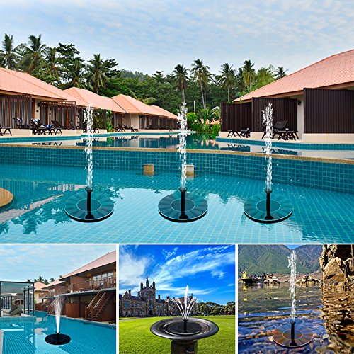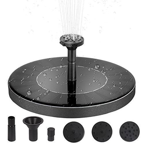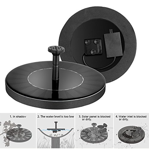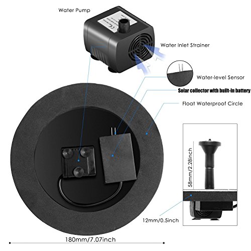 - 2018 New Upgraded Solar Fountain: Newest version 1.5W solar pump with build-in battery, still can work about an hour when sundown or in cloudy days, more stable than others water pump without battery. Solar recharge, no charger or no electricity needed, environment friendly
