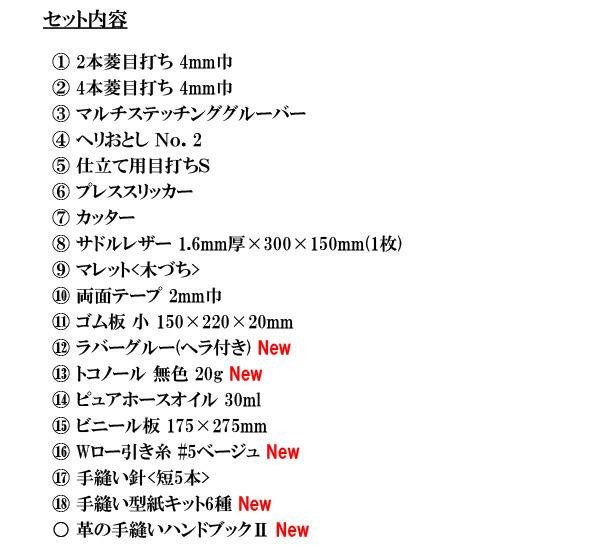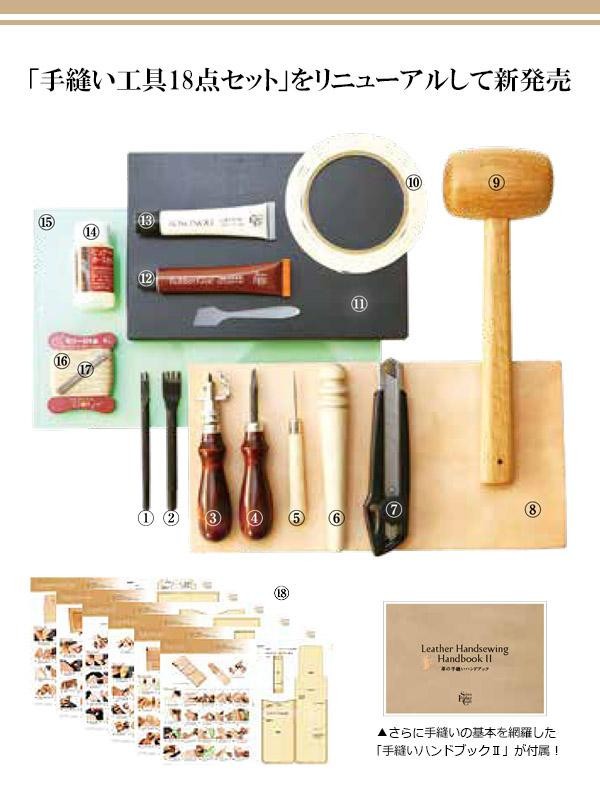 | レザークラフトの基本工具を網羅した18点に、革の手縫いハンドブックIIが付属したセット。一部工具・ケミカルを高性能のものに変更、さらに新作型紙を6種に増やし、高品質の基本工具セットにリニューアルしました。 |