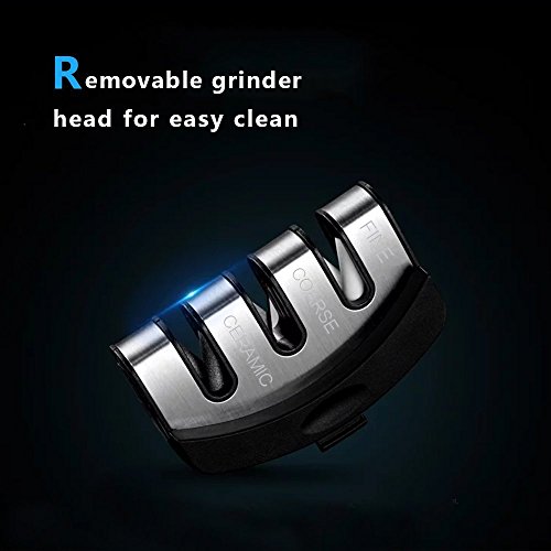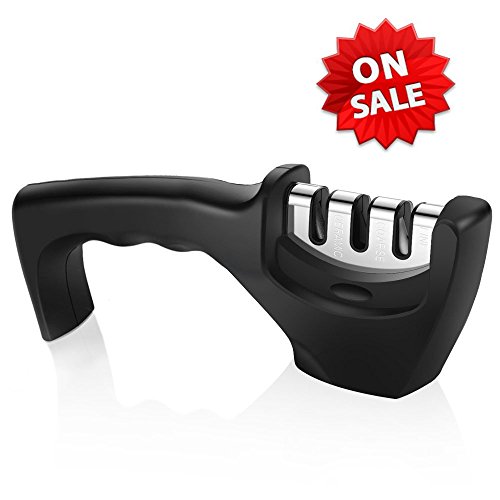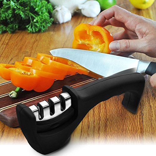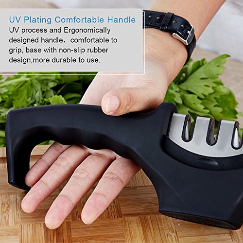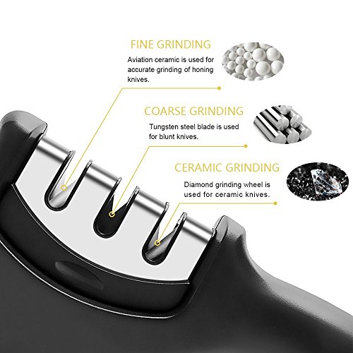 Kitchen Knife Sharpener: Durable 3-slot system sharpener, CERAMIC slot sharpening rod repairs and straightens damaged blades, COARSE slot sharpens to restore its V-shape. Finally, the 3rd slot fine tunes for a clean polish