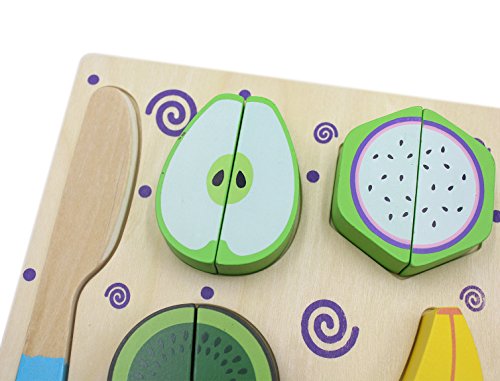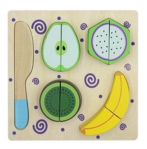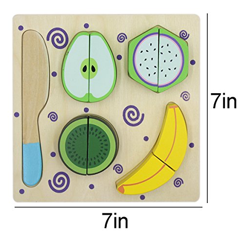 -. Feature : Include 1 wooden floor,1 knife,and 4 colorful food models like banana,pear,kiwifruit and dragon fruit. / Made of high-quality wood.Smooth surface,no sharp edges,non-toxic,no peculiar smell.A cotton hook is used between blocks to make sure baby's hands are safe when playing. / Baby matches the blocks of different shapes and colors in order.In this process,improve your baby's thinking capacity. / Cutting food with a knife,can exercise children's hand-eye coordination ability and create excellent hands-on skills. / Size:(Approx.)L*W*H:7.01*7.01*1.38inch.Recommend for age 3 years and up .