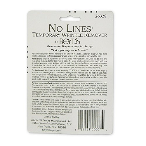 -. Binding : Health and Beauty -. Brand : REnoir -. Color : Pale pink -. EAN : 0012345678912 -. Feature : Like a facelift in a bottle - for men and women / Very effective temporary wrinkle remover / Use alone or over foundation / Helps reduce undereye puffiness and smooth lines / Instantly tightens skin for a smoother look -. Label : Boyd's Madison Avenue -. Manufacturer : Boyd's Madison Avenue -. MPN : NL5 -. PackageQuantity : 1 -. PartNumber : NL5 -. ProductGroup : Beauty -. ProductTypeName : HEALTH_PERSONAL_CARE -. Publisher : Boyd's Madison Avenue -. Studio : Boyd's Madison Avenue -. Title : Renoir No Lines Wrinkle Cream Facelift in a Bottle! -. UPC : 012345678912